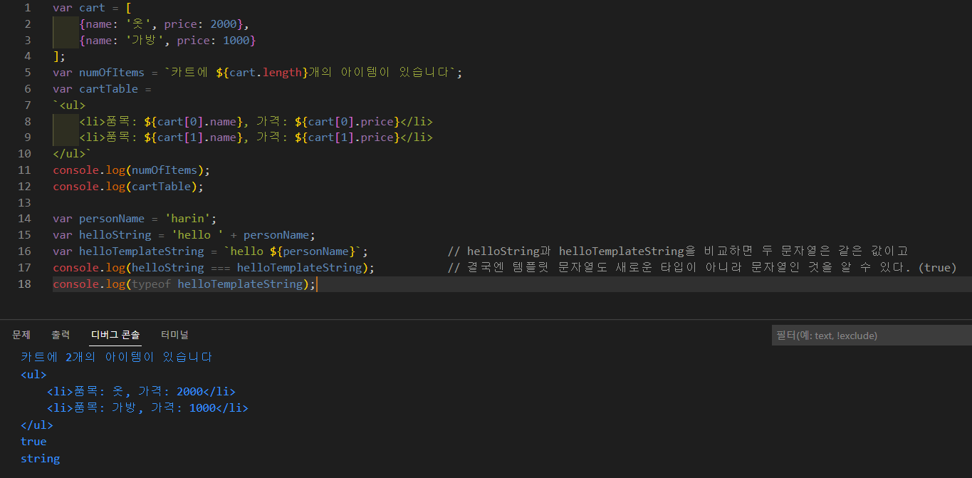 템플릿 문자열은 `[억음 부호]와 $[표현식]으로 나타낸다.