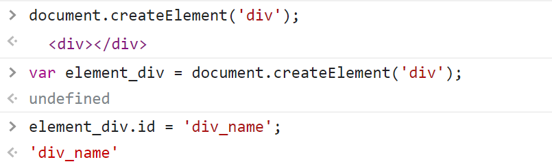3. element_div.id에 'div_name'을 대입하면 "div_name"이 출력된다. 이는 기존에 선언한 변수 element_div를 이용하여 div 태그에 id를 추가한 것과 동일하다.
